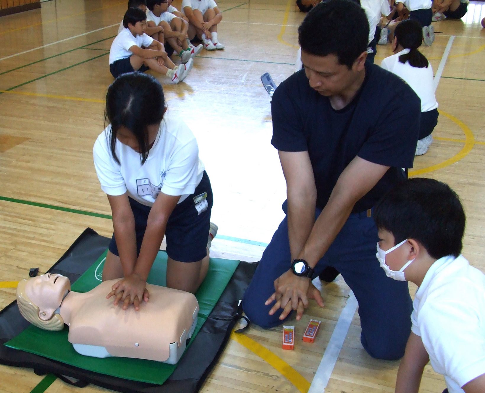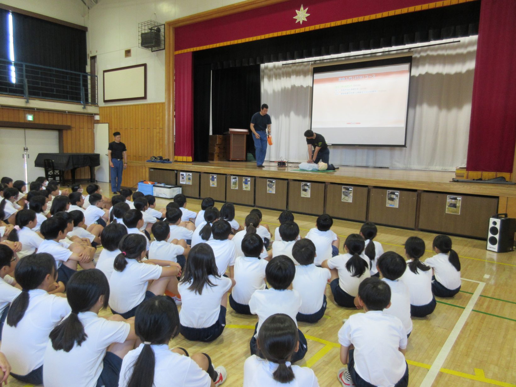 救命処置を実際に体験したときの様子を伝える動画や消防隊員の救急救命実演を見た後、5年生の児童一人一人が胸骨圧迫やAEDを使った体験をしました。いつ、どこで起こるか分からないけがや病気の場面に居合わせたとき、何をすべきかを実践的に学ぶことができました。児童は「救命処置ができることは大切なことだけれど、そのような状況になったときに慌てずに落ち着いて対応したいと思った。」「AEDが置いてある場所を確認して、自分にできることをしようと思った。」「人の役に立てることをしたい。」 などの感想をもちました。