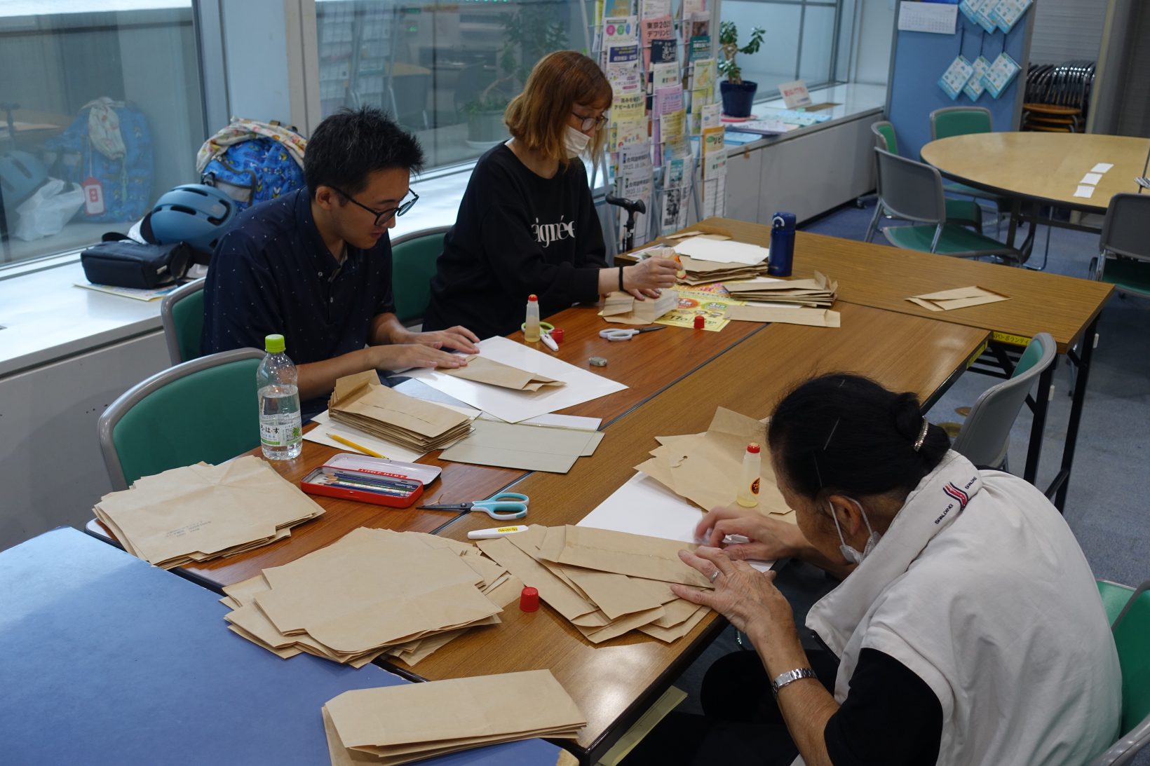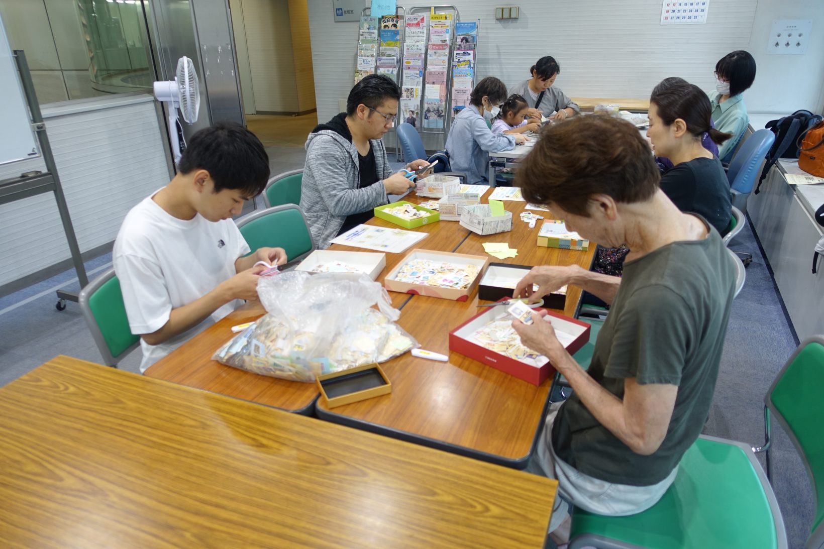 毎月1回、2時間の受入れをしています(飲食可・出入り自由、1月~3月を除く)。活動内容は、封筒作成、切手整理、紙折箱作成など6種類程度から選んでいただき、ひとりでも、友達・家族とでも、仕事・学校帰りや空き時間を利用して、気軽にボランティア活動ができるよう、設定をしています。今年度は、11月1日時点で、のべ63名の方に参加いただき、参加者同士でおしゃべりしたり、ぷらざ職員へボランティア活動についての質問をくださるなど、にぎやかな時間となっています。