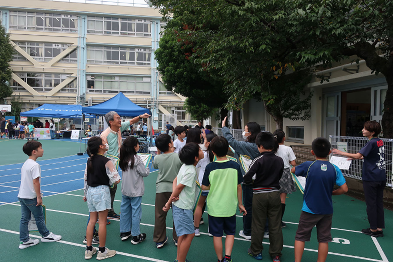 当初は区民向けの樹木相談だけでしたが、10年ほど前からは、テント内でどんぐりやまつぼっくりを使ったクラフトづくりも始め、今では200人分くらい用意した材料が足らないほどです。出前授業には早くから取り組み、児童の皆さんと一緒に、校庭の木で樹木診断もしています。普段は校庭の木が元気かどうかを観察することはないでしょうから、はじめに木の大きさを計測するときから、われ先にとメジャーで幹の周りを測ってくれます。予想外に元気がないことを知り、どうしたら元気になれるのか心配してくれます。