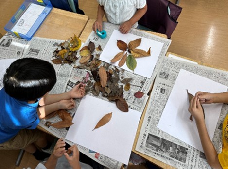 毎年行われる北区環境展では、「北区環境大学事業」を紹介するパネル展示と、小学生への出前授業を実施しています。今年の環境展では「はっぱであそぼう」をテーマにして、1年1、2、3組と5組の計4クラスで、落ち葉クラフトを楽しみました。授業の講師は東京家政大学の学生(3、4年生)が中心となり実施しました。児童には担任の先生を通じて「身の回りの落ち葉を拾ってくるように」伝えてありました。まずは落ち葉を観察します。大きさは?形は?色は?手触りは?そしてこれを、画用紙の上に並べ、張り付け、絵にしていきます。この授業を通して、児童の皆さんと、自然界にある生き物の多様性を感じ、楽しむことができました。これからも、自然に親しむ機会を増やしていただきたいなと思いました。